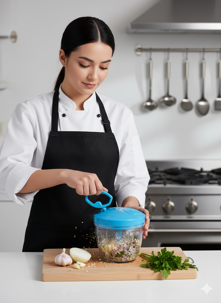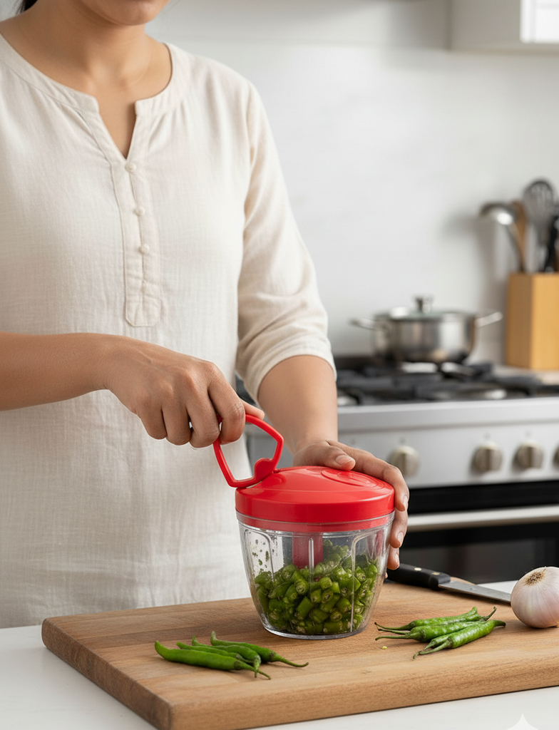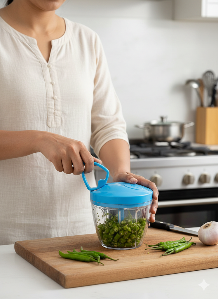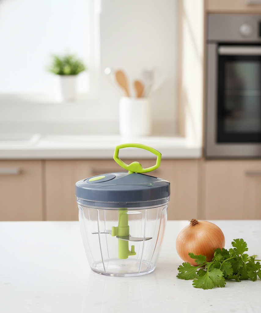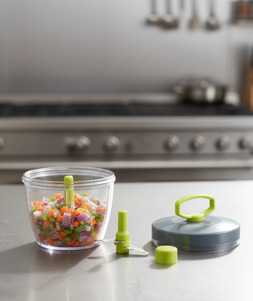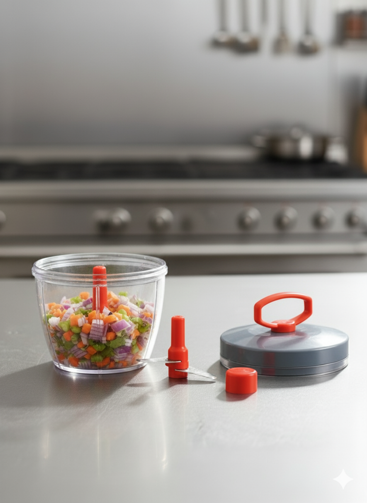 This is a compact, efficient, and easy-to-use manual food chopper designed to simplify your kitchen prep. It allows you to chop vegetables, nuts, herbs, and more in seconds without the need for electricity.